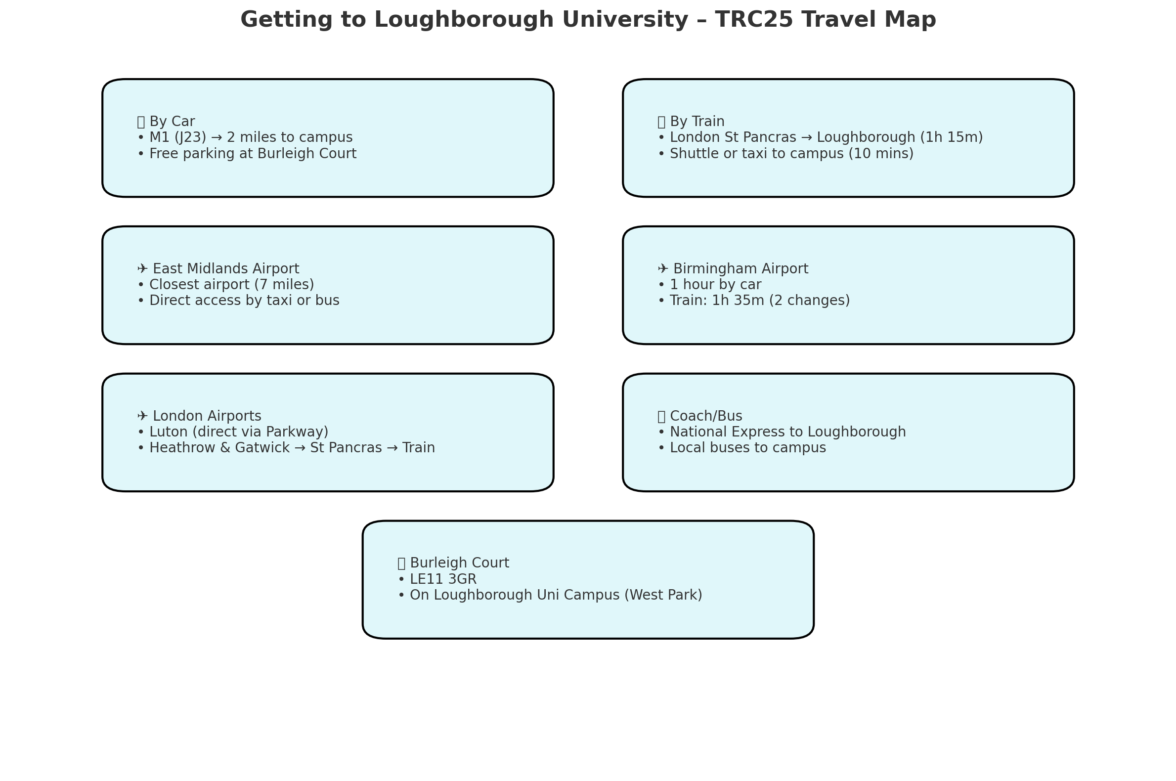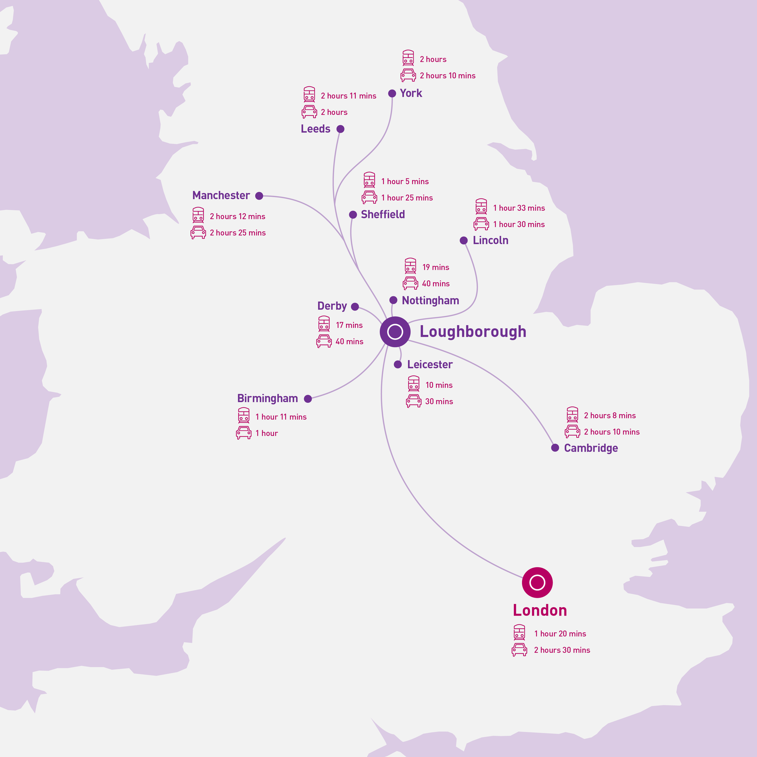Birmingham Airport – approx. 1 hour by car. Train to Loughborough involves 2 changes (via Birmingham New Street and Leicester) and takes ~1h 35m.